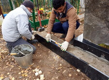 Вернувшись на участок, мы устанавливаем по периметру места захоронения гранитное ограждение, состоящее из невысоких столбиков и толстых балок. На углах оградки предусмотрены возвышения для лавочек. Параллельно мы застилаем территорию места захоронения геотекстилем – необходимой подложкой для любого наземного покрытия.