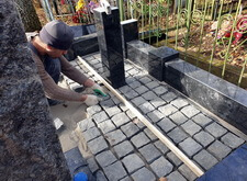 Сразу же после покрытия земли текстилем мы приступаем к гранитной брусчатке, одновременно конструируя в основании памятника простой прямоугольный цветник. Немного спиливаем брусчатку там, где ровному ряду мешает ножка будущего столика.