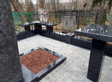 Далее мы приклеиваем лавочки и столешницу, в цветник засыпаем мульчу. Когда все работы на участке завершены – замываем брусчатку, тем самым смывая осевшую на памятнике и оградке бетонную пыль.