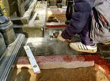 Когда работа с основанием практически завершена, переходим к следующему этапу – укладке гранитной брусчатки по периметру места захоронения. Во это же время покрываем гранитными плитами и залитый бетоном верх каркаса